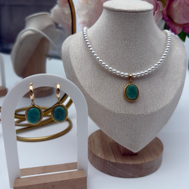 Les perles blanches éclatantes sont associées à un médaillon vert marbré, entouré d’un cercle doré en acier inoxydable, pour un rendu chic et moderne.